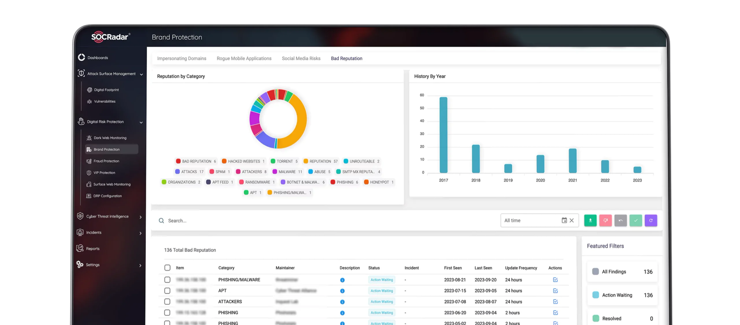 La plataforma de Protección de Riesgos Digitales de SOCRadar, habilitada por IA, analiza millones de dominios en la mayoría de los principales registradores para detectar dominios maliciosos dirigidos a su marca y a toda su red empresarial. Se activan alertas cada vez que algo cambia en un dominio sospechoso detectado.